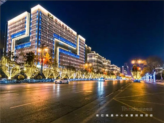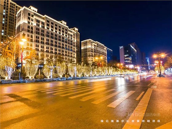玻璃幕墻與石材相結合的立面材質營造了保億隆基的高端商務氛圍,此次夜景亮化設計工程也是以營造商務氛圍為著力點,對保億隆基中心和風景御園等周圍建筑樓體進行統一亮度規劃。樓體頂部采用一級照明,營造天際線的效果。樓體四周采用內透光和局部照明手法,突出保億隆基的建筑外形和結構特色。路邊樹木采用三級照明,點綴照明效果,與周圍的夜景氛圍相協調。在信達電通的全過程服務下,保億隆基中心形成了具有層次韻律的夜間形態,加之得天獨厚的地理優勢,成為經開商務核心區的新標桿。
