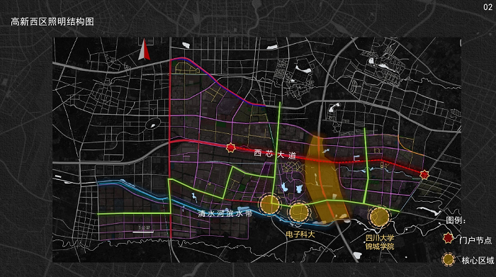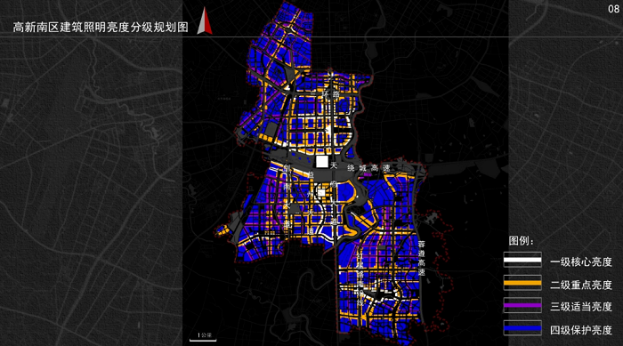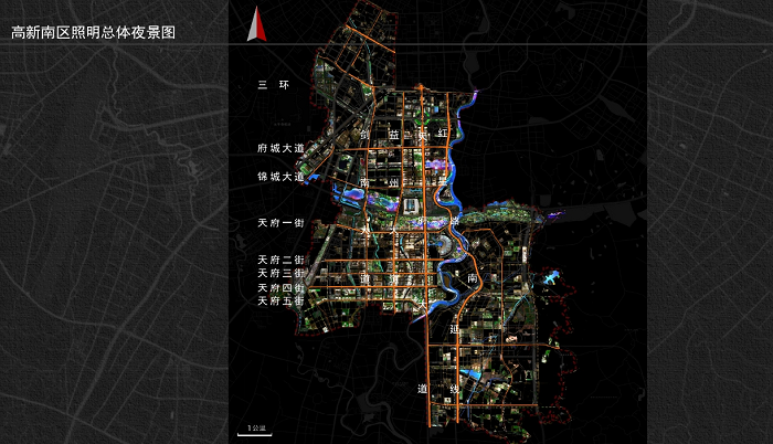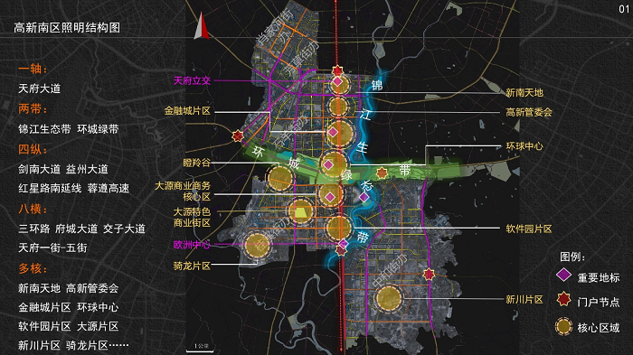 高新南區(qū)以天府大道為中軸線,形成一軸、兩帶、四縱、八橫、多核的照明結(jié)構(gòu)。