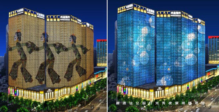 以民生為落腳點,打造品質西安、共享幸福西安,有一種東西,讓你無法抗拒,那就是追憶。同時借用建筑多媒體立面,采用LED點光源形成大屏幕,打造立面顯示屏效果,進行與地面景觀、樹林、機械臂顯示屏進行聯動顯示。