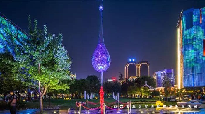 西安創業咖啡街區是西部的投資熱土和創業天堂,為打造創新創業新地標,信達電通通過明與暗、動與靜、冷與暖、光與影的對比,為西安創業咖啡街區夜景提升設計創造出具有層次感的燈光環境。周圍建筑與景觀改造形成統一步調,咖啡杯、水滴景觀、咖啡豆等景觀裝置和雙層咖啡巴士的創新設計提升咖啡街區的趣味性和藝術性,打造年輕、時尚、有活力的空間,形成西安新地標。