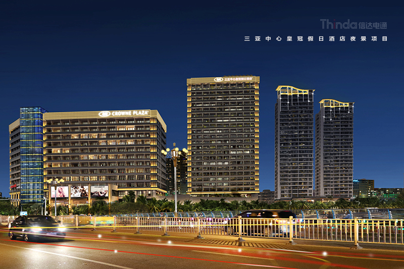 三亞中心皇冠假日酒店地處三亞市中心榆亞路,毗鄰景色秀麗的臨春河,與大東海沙灘及碧藍遼闊的中國南海近在咫尺;距離三亞鳳凰國際機場17公里,三亞火車站11公里,與鴻洲國際游艇會僅幾分鐘。周邊環繞活力四射的酒吧一條街,充滿時尚氣息的三亞國際購物中心,以及鹿回頭公園,三亞第一市場等眾多著名旅游景點。信達電通是三亞中心皇冠假日酒店外立面夜景照明的燈光設計商,此項目是三亞主城區夜景照明計劃規劃中的酒店亮化建筑,信達設計師團隊對此酒店外立面照明進行設計。